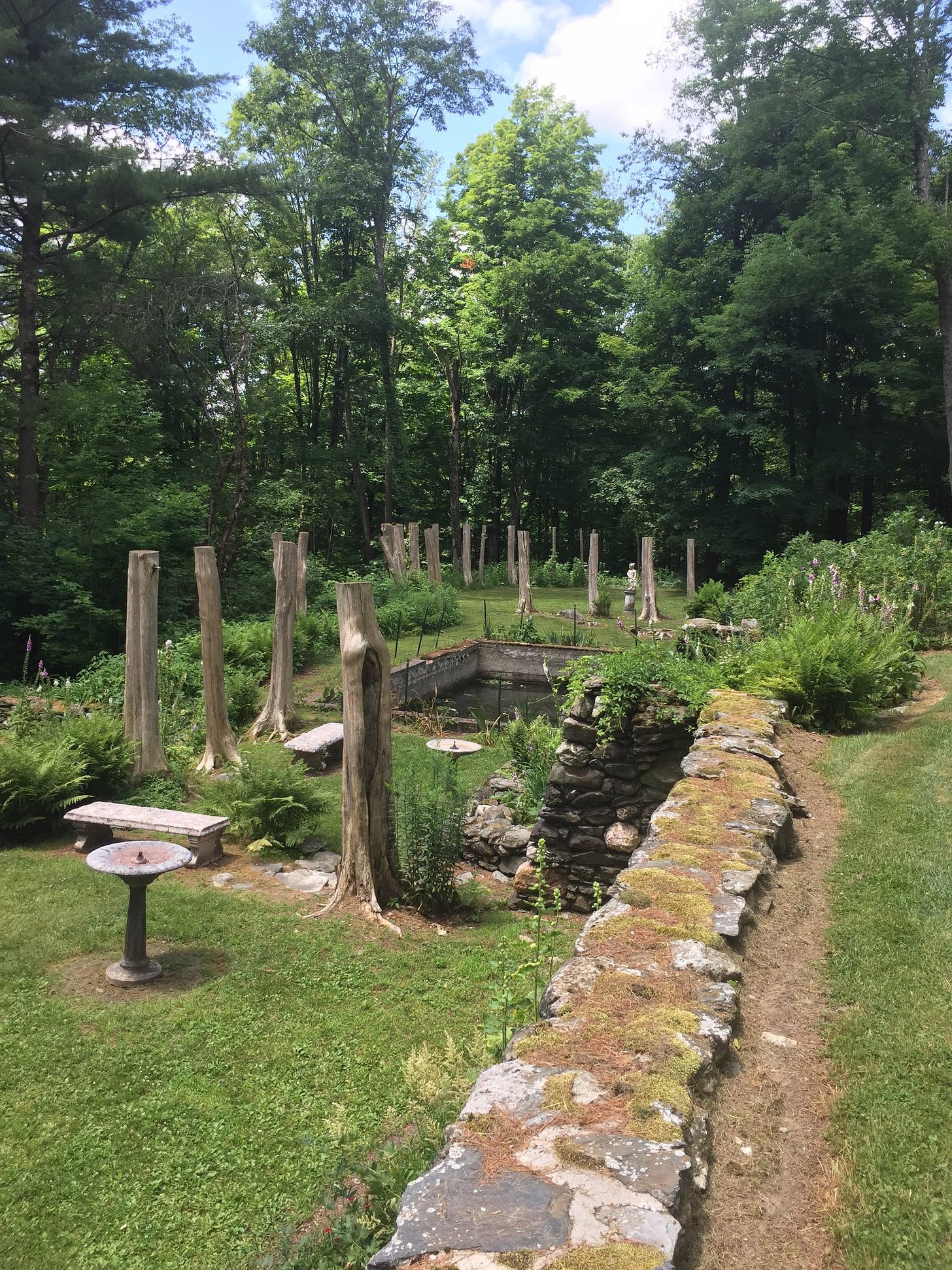 The weather on the day I visited Steepletop was perfect, warm and sunny. The first thing you notice, when walking up the hill, is what Vincent called “The Ruins” — a strange, whimsical garden with a door that leads to nowhere (there are three of these in the grounds near the house), an almost ritualistic planting of trees, and one small statue of a boy. The pool is the centerpiece — where clothes were never allowed if you wanted to go swimming. (Eugen generally wore just his hiking shorts most of the time in warm weather anyhow.) And, of course, there would have been the bar — beneath a renovated pergola, it no longer exists, but was taken from a New York speakeasy to be the home of Vincent’s ever-flowing gin habit.